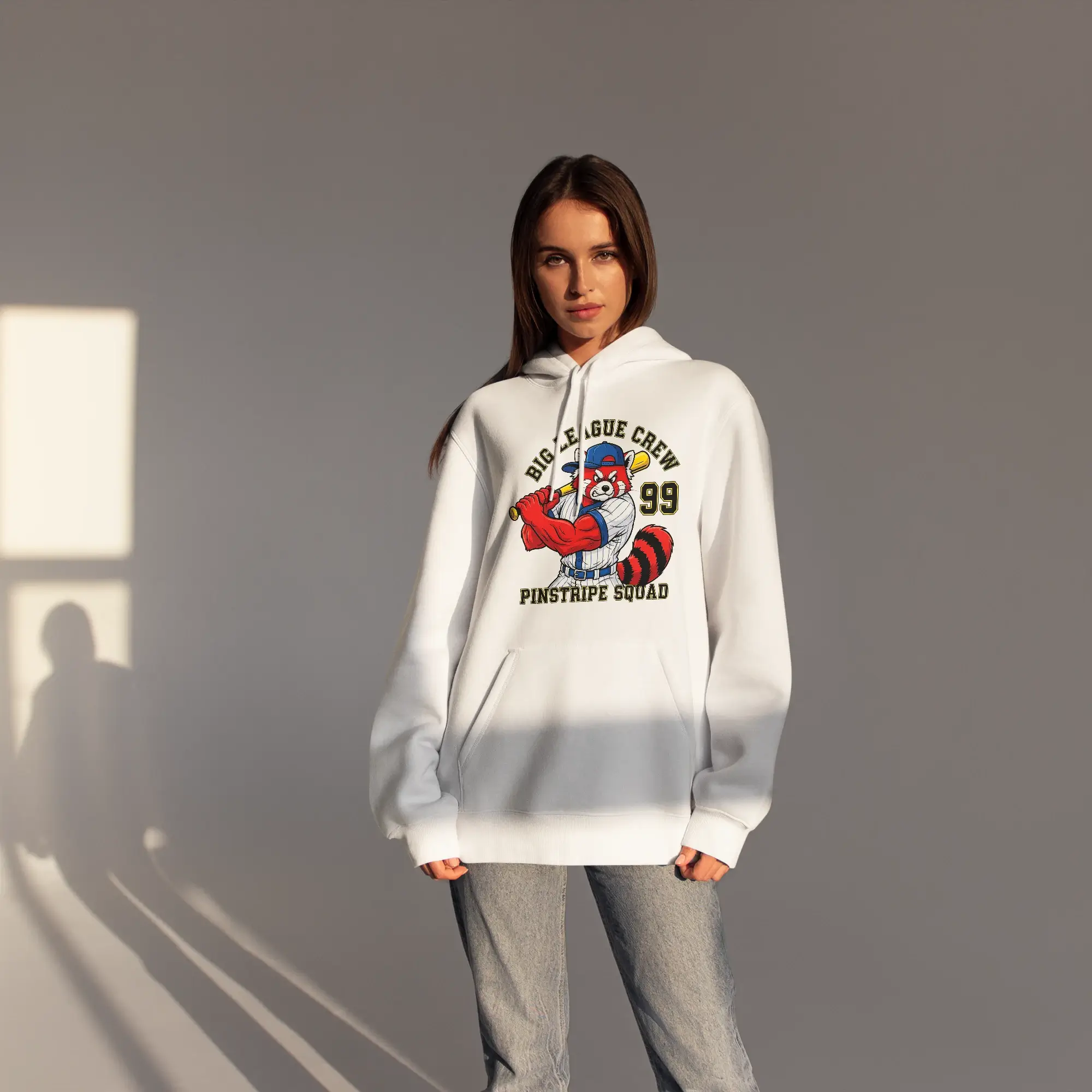Show off your unique team spirit with the Red Panda Baseball Mascot Hoodie! This eye-catching white tee features a vibrant red panda, fully geared up in a sharp pinstripe uniform and cap, numbered 99, and ready to swing the bat. The text “BIG LEAGUE CREW” and “PINSTRIPE SQUAD” proudly frame this powerful, cartoon mascot.