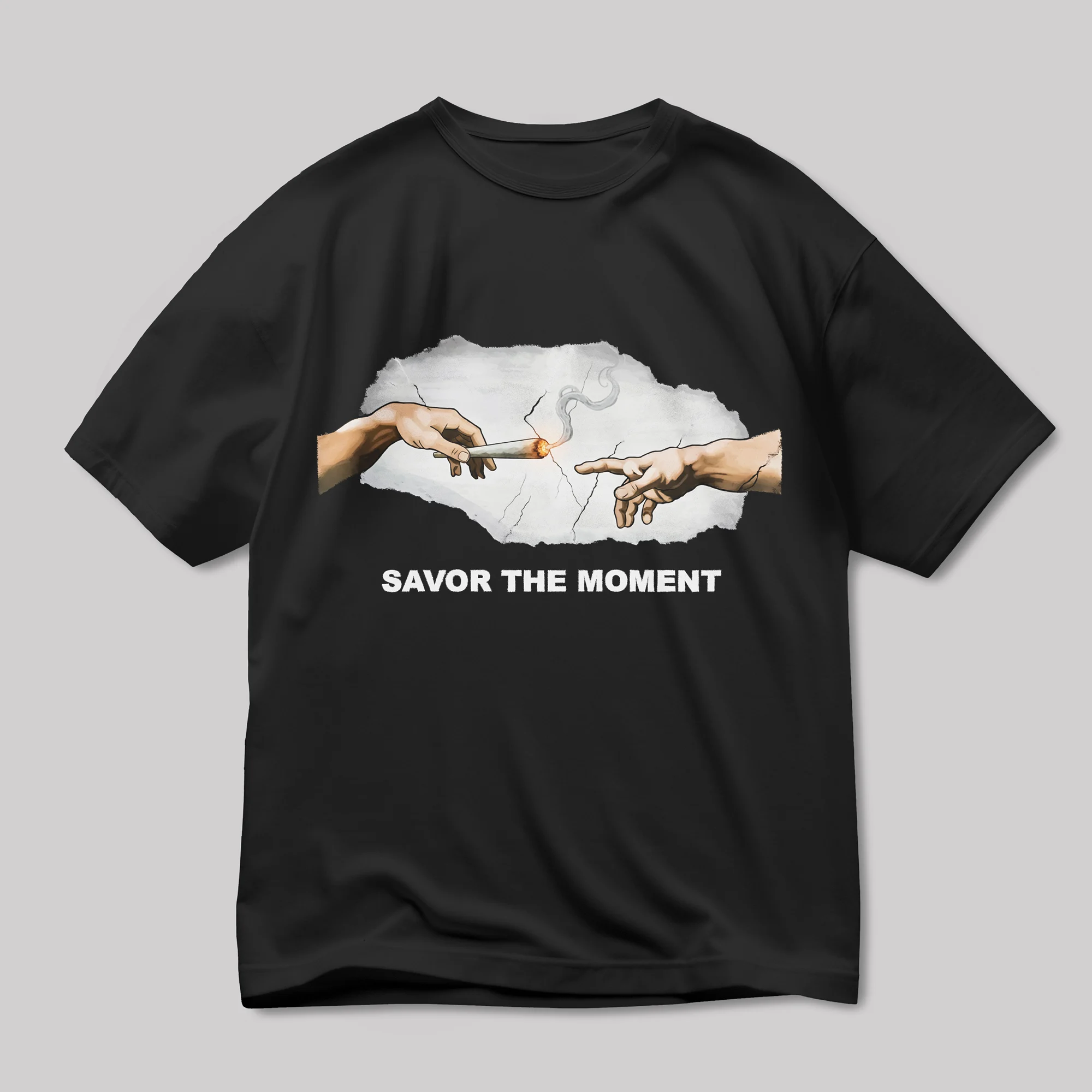 Merge classic art with modern-day relaxation with the Savor The Moment T-Shirt. This unique design cleverly spoofs Michelangelo’s iconic Creation of Adam fresco, replacing the spark of life with the passing of a lit joint. The phrase “SAVOR THE MOMENT” beneath the graphic adds a witty and chill commentary.