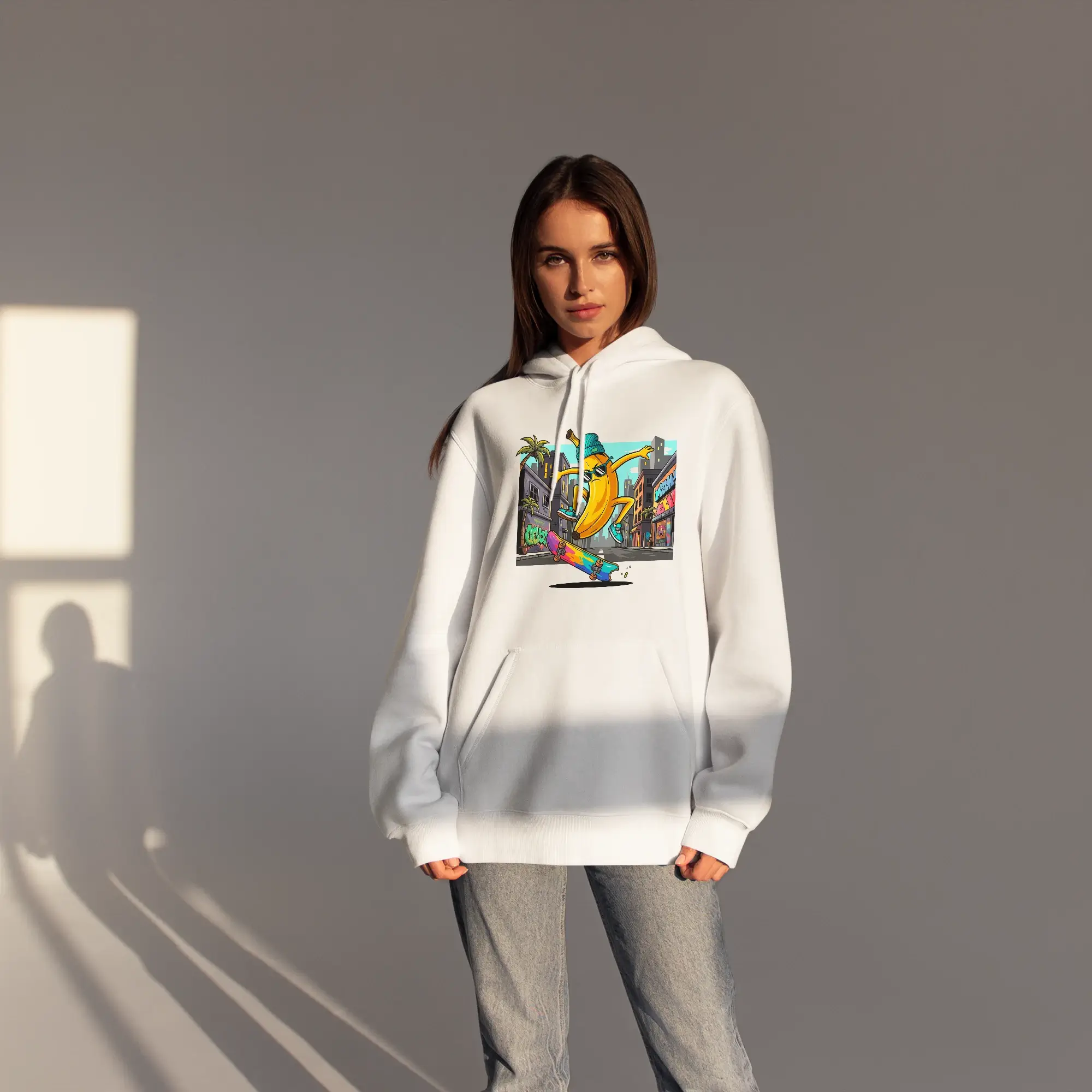 Hit the streets in style with the Skateboard Banana Street Graphic Tee! This lively white Hoodie features a dynamic, full-color illustration of the coolest banana in town, wearing a beanie and shades while catching air on a vividly colored skateboard in a bustling city street scene.